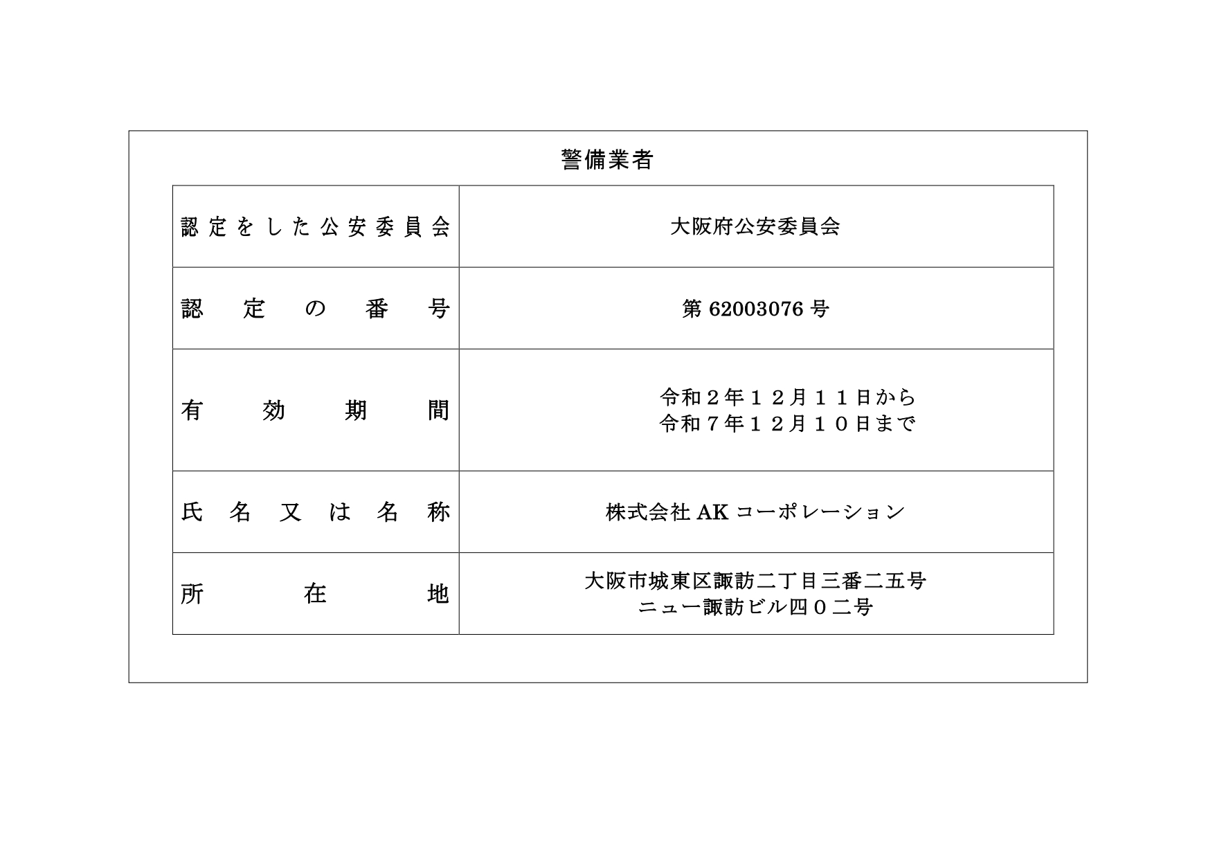 許可・認定 | 警備業 大阪府公安委員会 第62003076号認定 【認定書はこちら】 |